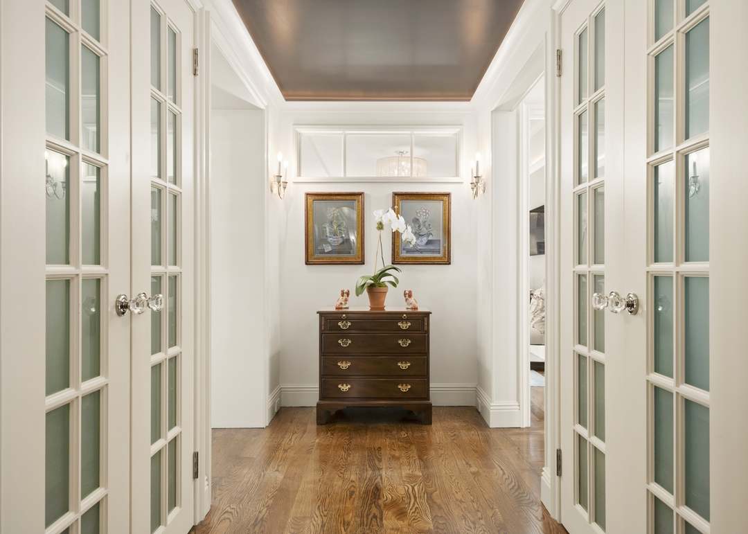 A refined hallway gallery anchored by a traditional mahogany chest of drawers and framed botanical art, showcasing classic New England elegance through symmetrical glass-panel doors, crown molding, and a tray ceiling with warm bronze sconces. The neutral palette and high-quality wood flooring create a sophisticated, light-filled transitional space that balances traditional architecture with contemporary minimalism.