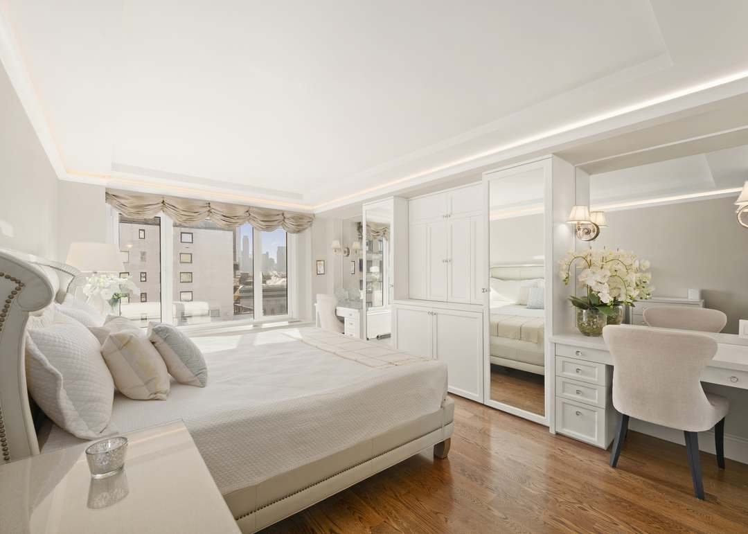 A stunning primary bedroom suite featuring an all-white sophisticated palette with abundant natural light from floor-to-ceiling windows and glass doors opening to a spa-like ensuite. The space combines transitional elegance with Hamptons-style refinement through custom millwork, a tray ceiling with subtle crown molding, a mirrored vanity desk with designer lighting, and a luxuriously appointed walk-in closet, all unified by warm hardwood flooring and soft neutral furnishings.