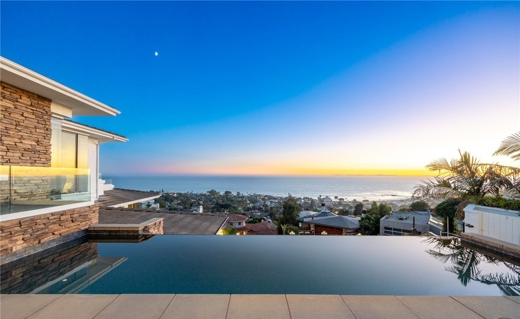 A stunning infinity pool overlooking the Pacific Coast exemplifies modern luxury living with seamless indoor-outdoor integration. The expansive stone patio, contemporary stone facade, floor-to-ceiling windows, and golden-hour lighting create a serene yet grand resort-like atmosphere with breathtaking coastal views and impeccable design execution.