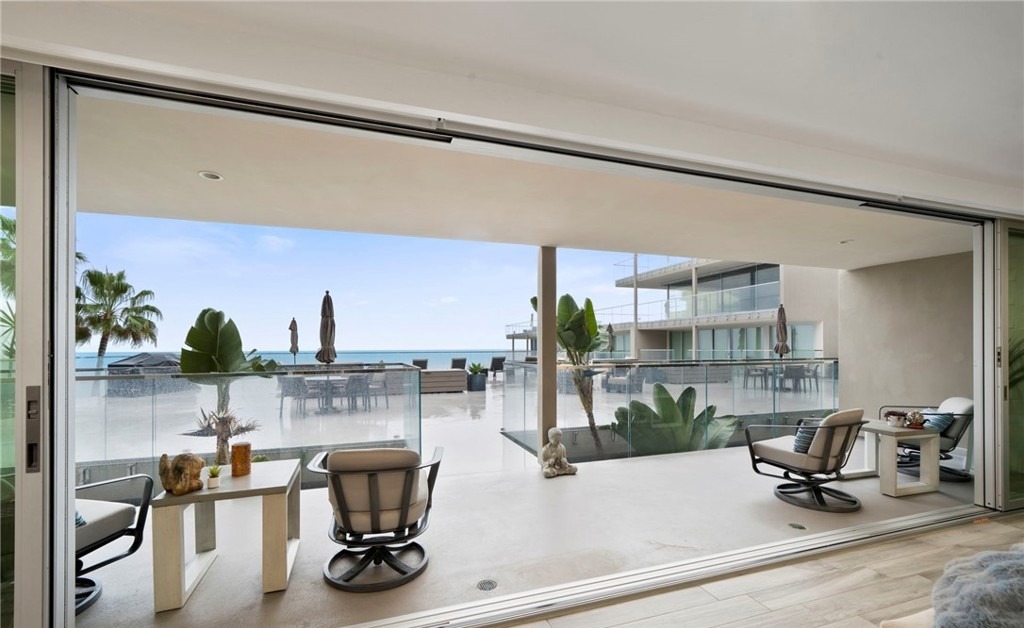 An expansive oceanfront patio featuring seamless indoor-outdoor living with minimalist concrete flooring, contemporary furnishings, and unobstructed sea views framed by floor-to-ceiling glazing. The serene palette of whites, beiges, and grays is enhanced by carefully curated potted plants and a sophisticated pergola-covered dining area, epitomizing refined coastal modern luxury.