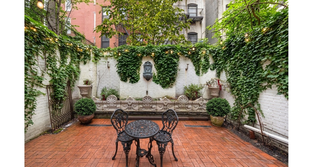 A stunning European-inspired courtyard patio featuring cascading ivy-covered brick walls, terracotta tiling, and ornate cast-iron garden furniture arranged around a central focal point. The space exudes old-world elegance with carefully curated architectural details, classical wall fountains, and lush greenery that creates an intimate, romantic atmosphere reminiscent of a Mediterranean villa or Parisian garden.