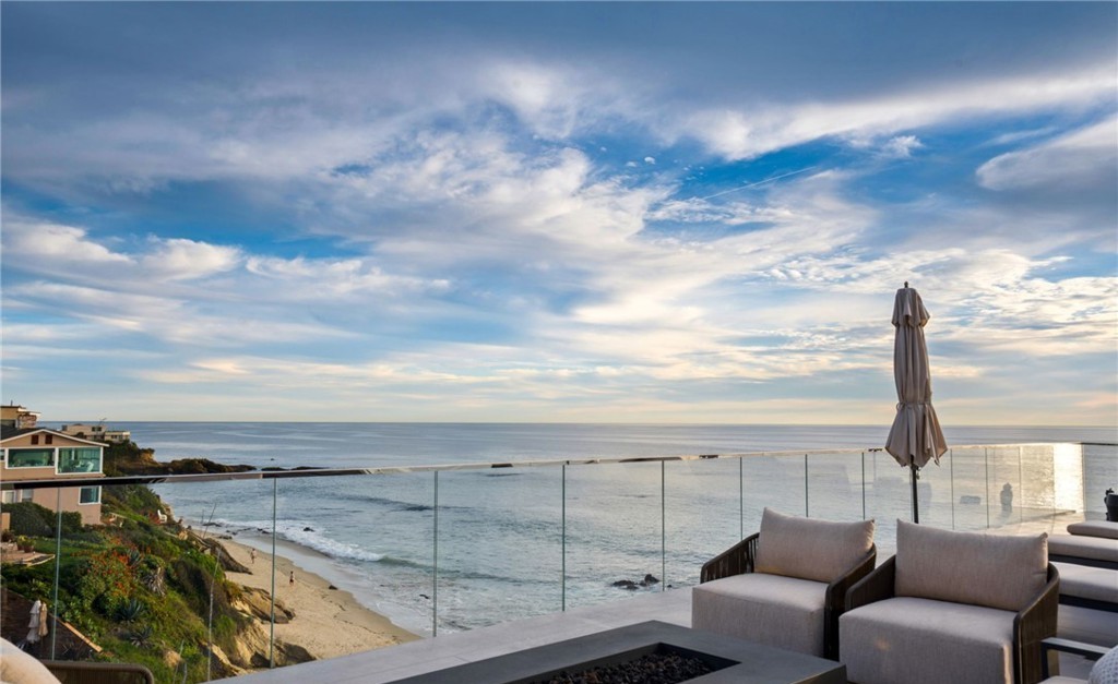 A sophisticated coastal patio overlooking pristine oceanfront views, featuring minimalist gray upholstered lounge chairs, a modern fire pit, and frameless glass railings that maximize the seamless indoor-outdoor connection. The design balances serene elegance with California modern aesthetics, emphasizing clean lines, natural materials, and breathtaking panoramic vistas.