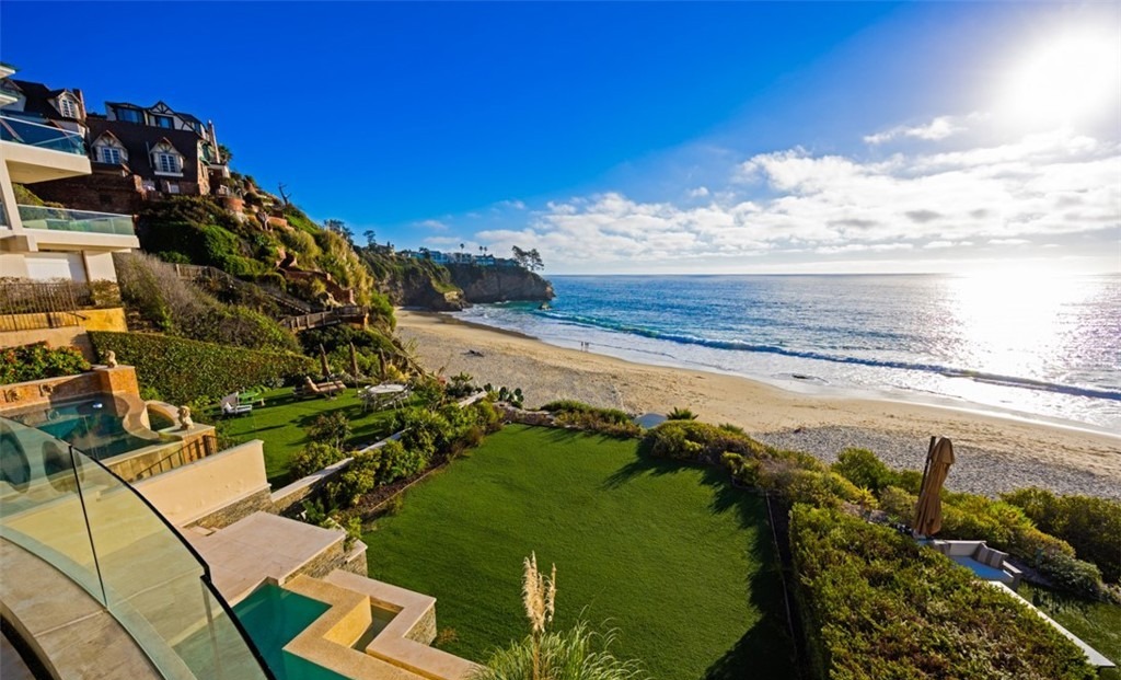 An ultra-luxury coastal cliff-top patio featuring manicured lawns, modern glass railings, and direct ocean views with pristine beach access below. The design exemplifies sophisticated Southern California modern living with seamless indoor-outdoor integration, combining contemporary architecture with natural materials and a serene, minimalist aesthetic.