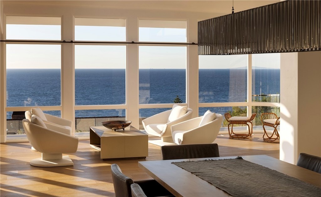 A stunning oceanfront living room featuring expansive floor-to-ceiling windows that frame unobstructed blue-water views, with warm hardwood flooring and a curated collection of sculptural cream upholstered furniture. The space exemplifies organic modern design with natural textures, abundant natural light, and an effortless blend of coastal elegance and contemporary sophistication.