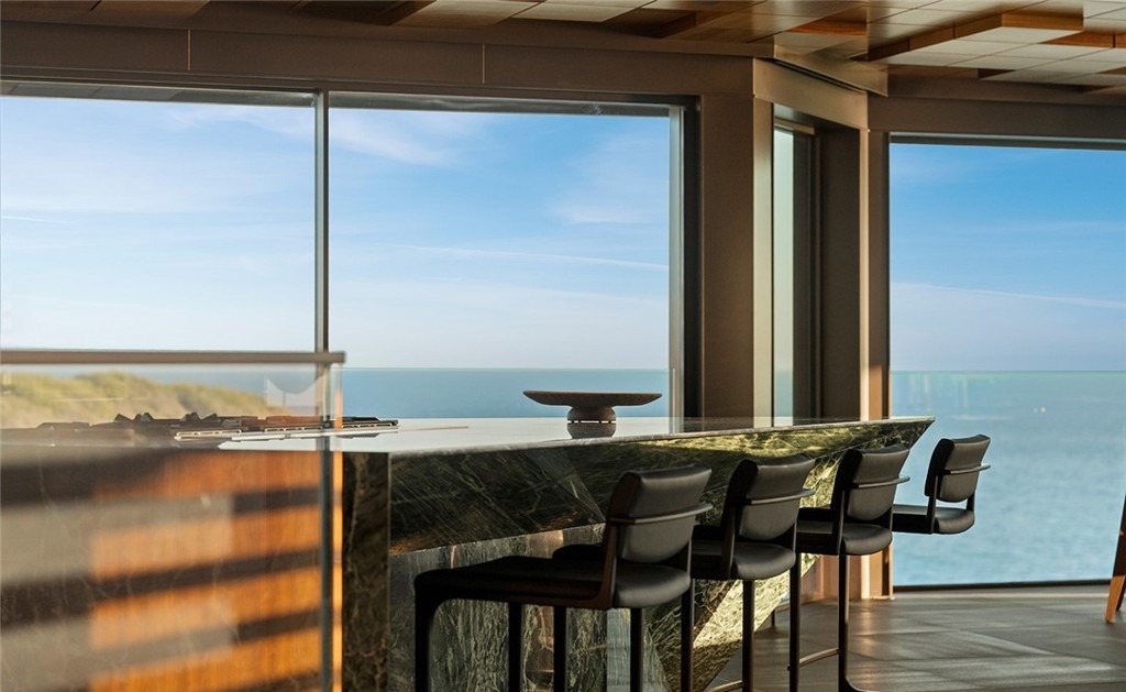 A breathtaking modern oceanfront outdoor kitchen features floor-to-ceiling glass walls that dissolve the boundary between interior and exterior, with a stunning marble bar counter and panoramic sea views. The minimalist aesthetic is elevated by sophisticated black hardware, warm metallic accents, and an airy open design that epitomizes contemporary coastal luxury living.