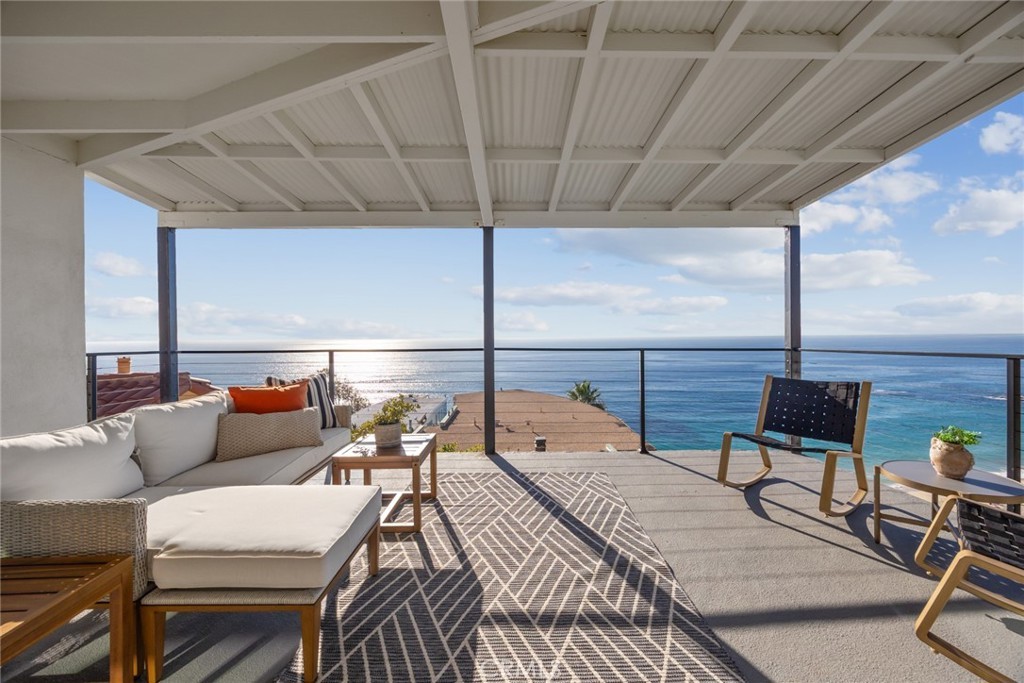 A stunning modern coastal patio featuring expansive ocean views framed by floor-to-ceiling glass walls and a sleek metal pergola roof. The thoughtfully curated space combines natural materials (composite decking, wood furnishings, rattan seating) with refined minimalist design, creating an effortlessly luxurious indoor-outdoor living experience.