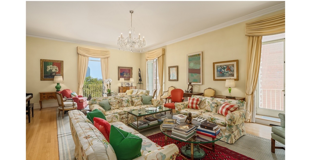 A classically elegant living room featuring warm cream and pale yellow walls, layered with traditional furnishings including floral-patterned sofas accented with red and green velvet pillows, creating a refined and collected aesthetic. Floor-to-ceiling windows flood the space with natural light, while a crystal chandelier and gilt-framed artwork enhance the sophisticated, timeless appeal.