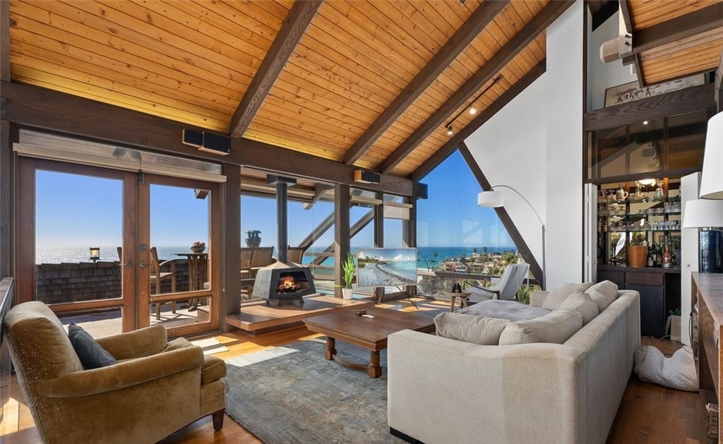 A breathtaking coastal modern great room featuring dramatic exposed wood-plank ceilings with black structural beams, floor-to-ceiling glass doors opening to sweeping ocean and coastal views. The warm, light-filled space effortlessly blends natural materials (hardwood flooring, natural wood furnishings) with contemporary furnishings in cream and neutral tones, anchored by a sculptural fireplace and elevated by abundant natural light and panoramic vistas.