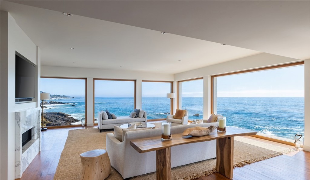 An ultra-luxury oceanfront living room showcasing seamless indoor-outdoor integration with expansive floor-to-ceiling windows framing dramatic coastal views. The sophisticated organic modern design combines warm natural wood furnishings, soft neutral upholstery, and curated accessories with clean architectural lines, creating a serene yet refined sanctuary that emphasizes connection to the stunning seascape.