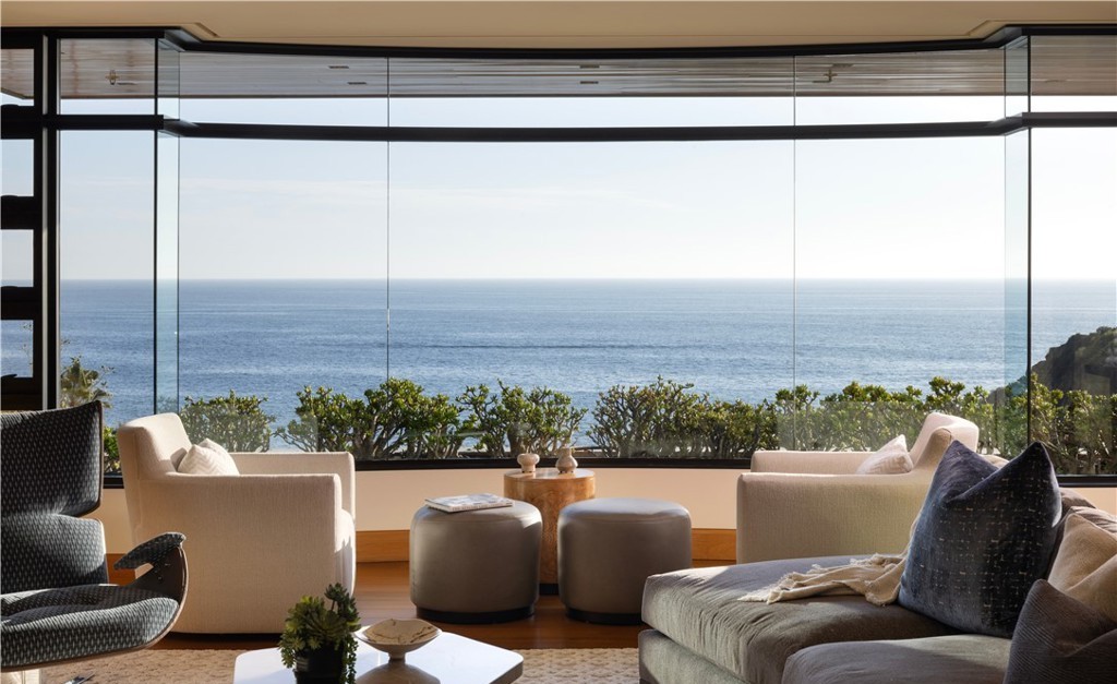 An ultra-luxury oceanfront patio featuring expansive frameless glass walls that dissolve the boundary between interior and exterior, offering unobstructed sea views and seamless indoor-outdoor living. The space elegantly combines organic modern design with coastal sensibilities through a refined palette of cream, beige, and soft grays, natural wood flooring, and curated contemporary furnishings that prioritize comfort and visual clarity.
