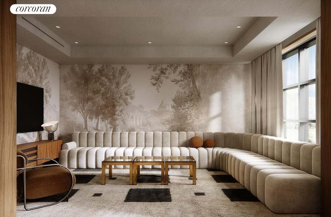 A sophisticated seating lounge with an expansive curved sectional upholstered in soft cream linen, anchored by a striking mural-style landscape wall treatment. Large floor-to-ceiling windows flood the space with natural light, while warm wood accents, recessed ceiling lighting, and carefully curated furnishings create a serene, gallery-like atmosphere of understated luxury.
