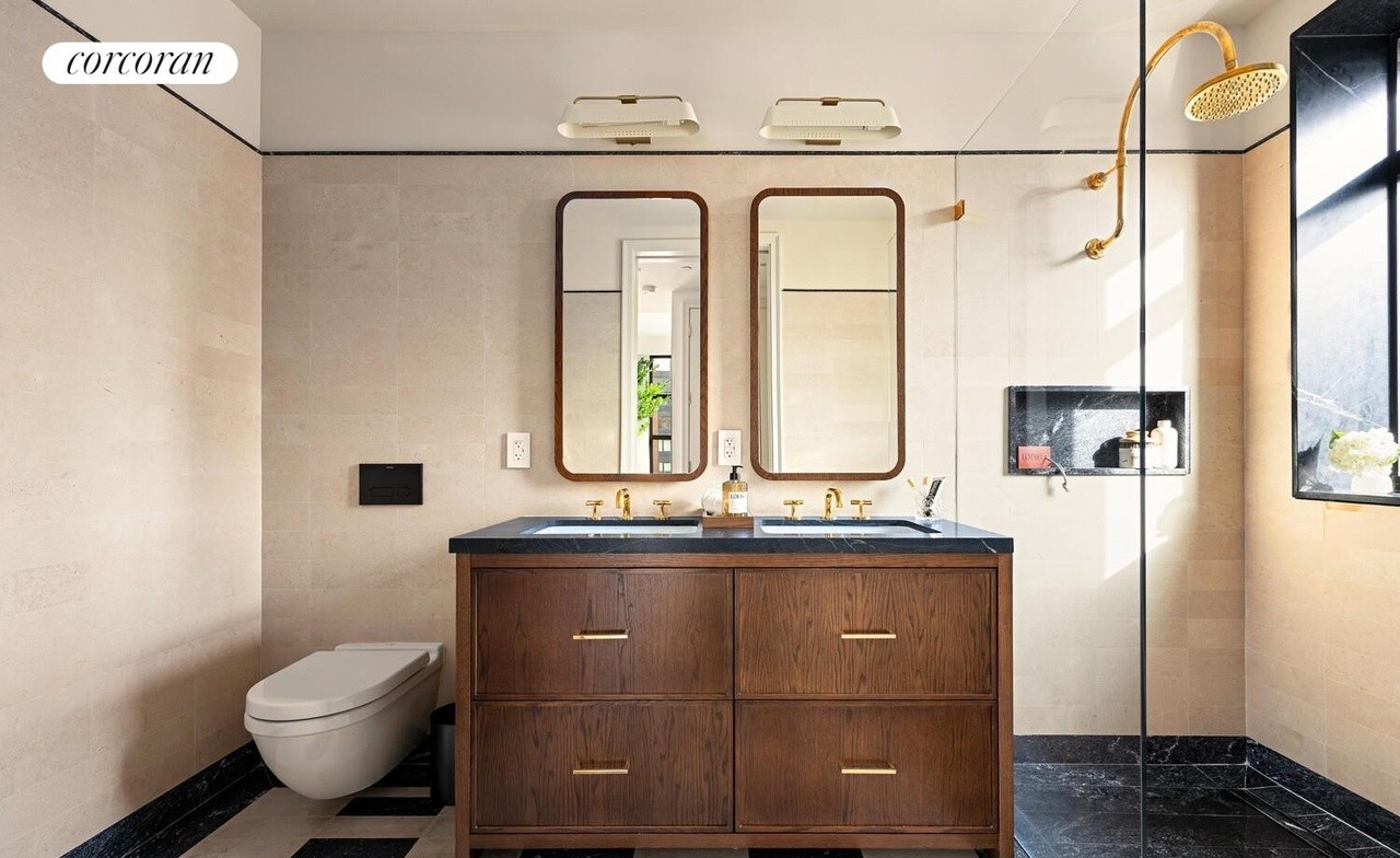 A sophisticated primary bathroom featuring a floating double vanity with warm medium-brown oak cabinetry, pale blue quartzite countertop, and brass fixtures. The space balances understated elegance with modern luxury through clean lines, frameless glass shower enclosure, and a refined palette of creams, blacks, and brass accents, supported by abundant natural light and high-quality finishes.