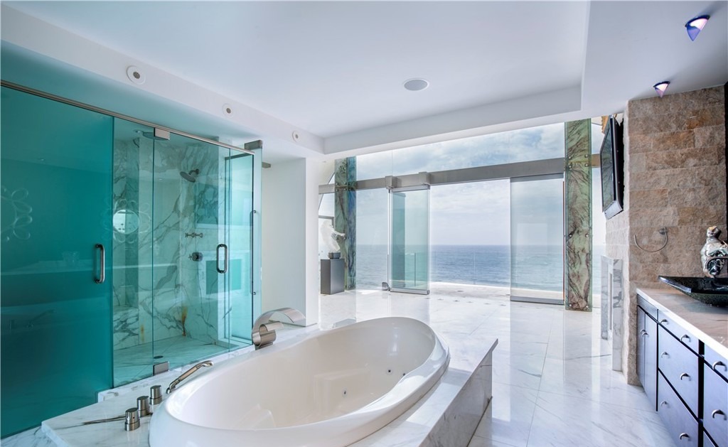 Freestanding TubFrameless Glass ShowerDouble VanityFloating VanityFloor To Ceiling WindowsOcean ViewRecessed LightingMarble SurroundHigh CeilingsOpen Concept To Patio