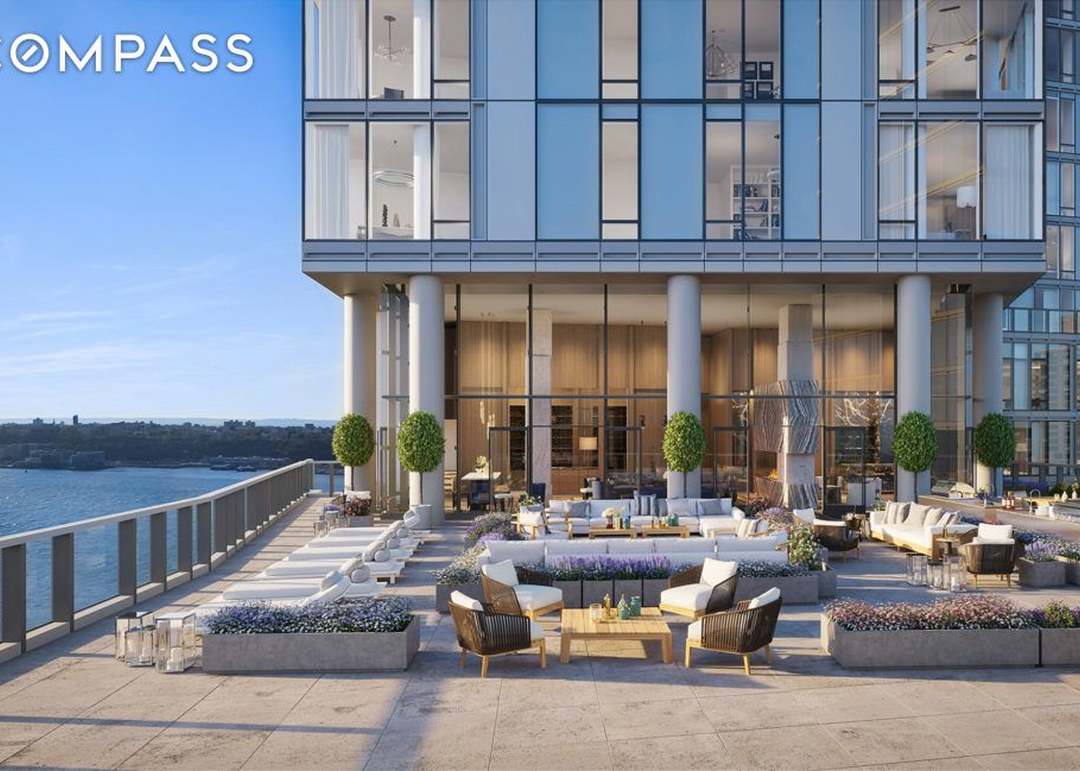 An expansive waterfront terrace featuring sophisticated outdoor living with clean-lined furnishings, sculptural topiary, and fire elements positioned overlooking blue water. The space seamlessly integrates the high-rise building's modern glass facade with curated landscape design and neutral luxury seating, exemplifying contemporary coastal resort-style living.