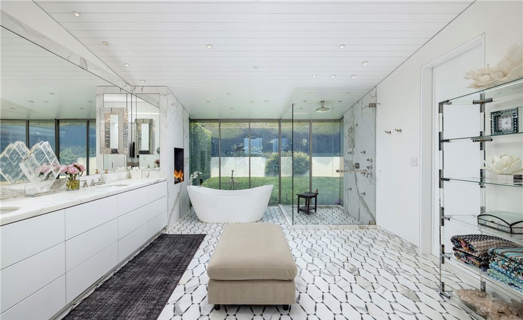 Freestanding TubWalk In ShowerDouble VanityFloating VanityFloor To Ceiling WindowsFrameless Glass ShowerBuilt In ShelvingRecessed LightingOpen ShelvingStatement SeatingNatural Light