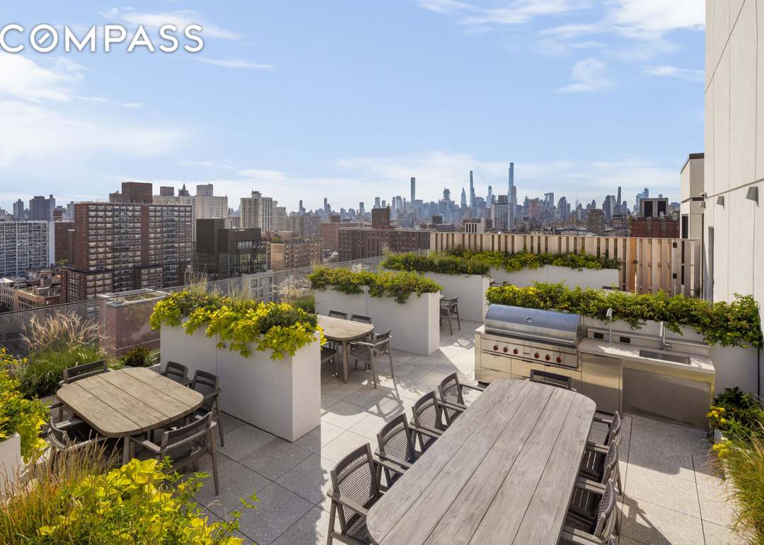 A stunning rooftop outdoor kitchen overlooking the Manhattan skyline, seamlessly blending contemporary design with organic modern elements through living walls, concrete surfaces, and minimalist furnishings. The space commands dramatic views and showcases professional-grade cooking equipment integrated into a sophisticated entertaining zone with multiple dining areas.