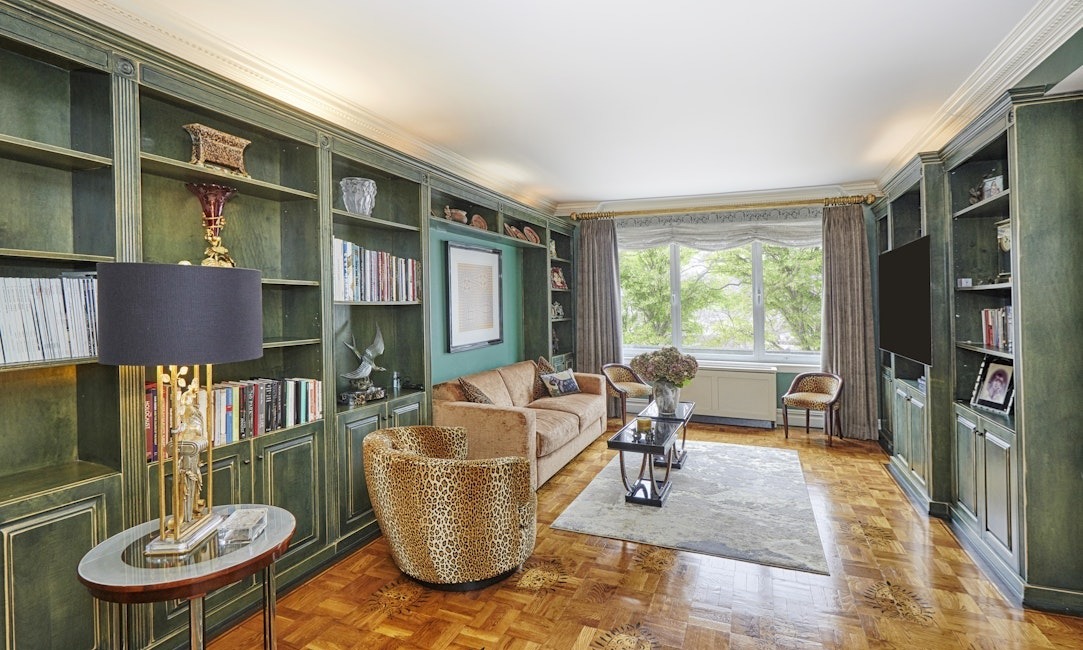 A sophisticated library and sitting room featuring custom sage-green painted built-in cabinetry with brass hardware, inlaid hardwood floors with geometric sunburst patterns, and abundant natural light from curved windows. The space elegantly blends traditional architectural elements like crown molding and coffered ceiling details with curated contemporary furnishings, including a leopard-print accent chair and neutral tonal sofa, creating a refined, museum-quality environment.