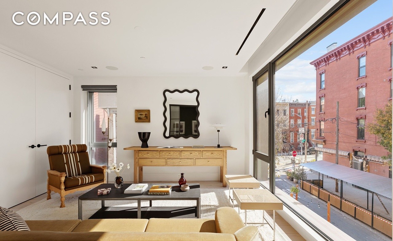 A sophisticated transitional living room with clean modernist lines and warm natural materials, anchored by a sculptural black-framed mirror and light wood console table. Abundant natural light from floor-to-ceiling windows overlooking a historic urban street creates an airy, gallery-like atmosphere elevated by carefully curated furnishings and restrained color palette.