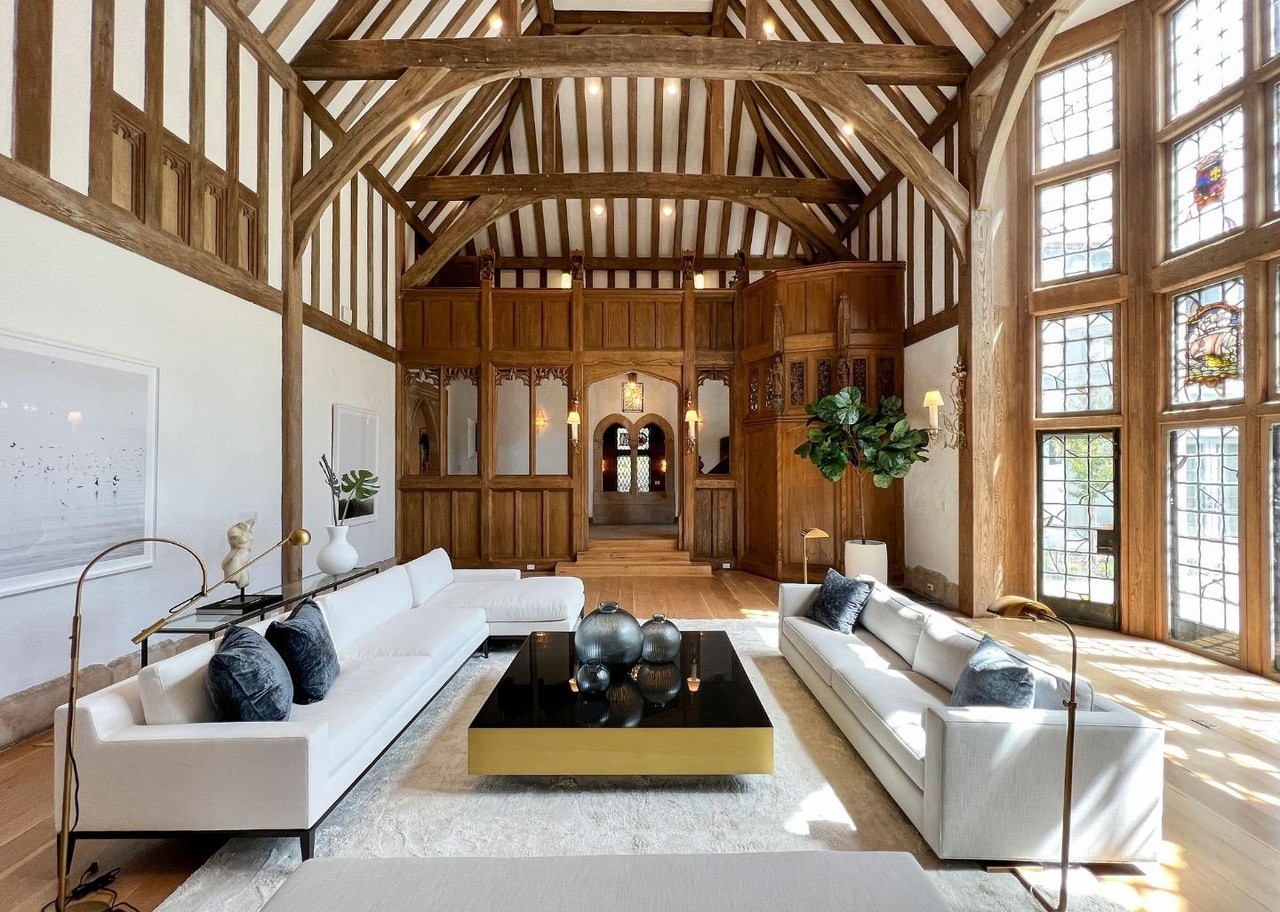 A stunning Tudor-inspired great room featuring dramatic exposed timber beams and a cathedral ceiling, anchored by a sophisticated seating arrangement of cream-upholstered sofas arranged around a black and gold contemporary coffee table. The space masterfully blends traditional architectural elements—evident in the ornate wood paneling, leaded glass windows, and period detailing—with curated modern furnishings and abundant natural light, creating an airy yet opulent atmosphere.