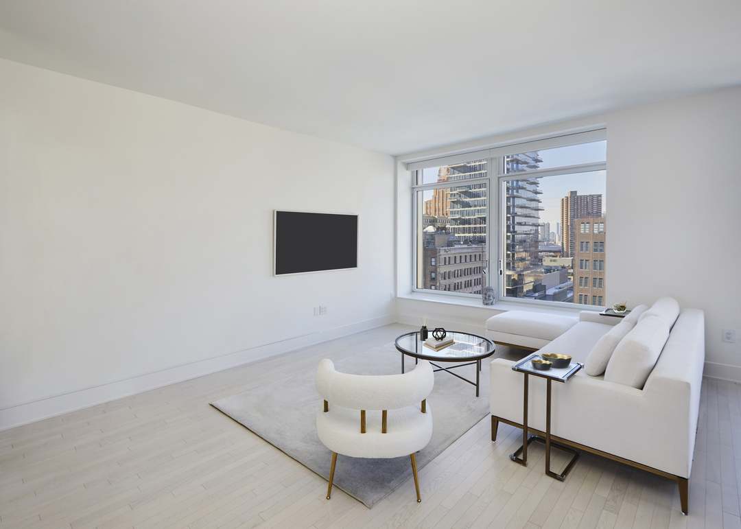 A sophisticated minimalist living room featuring floor-to-ceiling windows with panoramic urban views, anchored by a curated collection of cream and white upholstered seating with brass-accented legs. The space exemplifies luxury restraint through its monochromatic palette, light oak flooring, and carefully composed furnishings that prioritize negative space and architectural clarity.