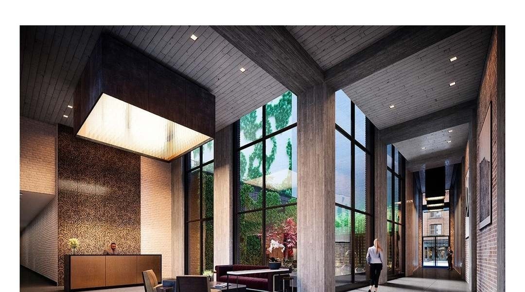 A stunning contemporary entryway that seamlessly blends organic materials with minimalist design, featuring dramatic floor-to-ceiling windows overlooking a verdant living plant wall, dark wood-plank ceilings, exposed brick, and sculptural modern furnishings on polished concrete floors. The space achieves a sophisticated balance between raw industrial elements and refined luxury through carefully curated material pairings and abundant natural light.