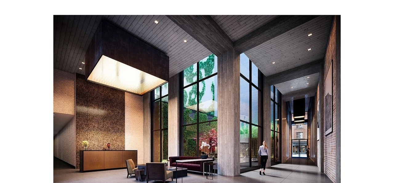 A dramatic contemporary entryway featuring soaring wood-plank ceilings, warm brick walls, and expansive floor-to-ceiling windows that frame a living green wall. The space blends organic materials with refined minimalist furniture and statement lighting to create a grand yet serene arrival experience.