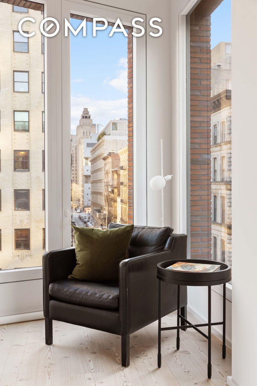 A refined entryway lounge overlooking a classic Manhattan street canyon through expansive floor-to-ceiling windows, featuring a minimalist black leather armchair paired with an olive-green accent pillow and a sleek side table. The space exemplifies restrained luxury with neutral painted walls, warm light hardwood flooring, and strategic statement lighting—creating an airy, gallery-like retreat that frames the urban architecture beyond.