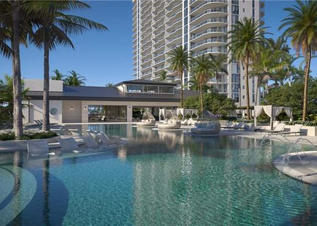 An ultra-luxury resort-style pool area featuring crystalline turquoise waters, minimalist contemporary architecture, and abundant palm landscaping framed by high-rise residential towers. The space balances sophisticated modern design with tropical warmth, offering an elevated outdoor living experience with lounge furniture, a covered pavilion, and meticulously manicured grounds.
