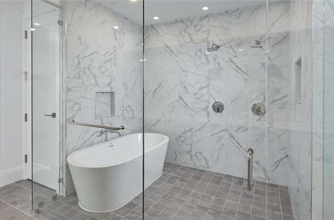 A spa-like primary bathroom featuring a sculptural freestanding soaking tub positioned prominently alongside a generous walk-in shower with dual showerheads, all unified by dramatic large-format marble tile with subtle gray veining. The palette is sophisticated and serene—white, light gray, and charcoal—creating a tranquil retreat with clean modernist lines softened by the organic beauty of natural stone.
