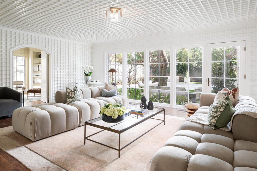 A stunning contemporary living room featuring sculptural channeled upholstery in warm cream tones, anchored by a sophisticated metal-framed coffee table and abundant natural light flooding through expansive glass doors overlooking manicured gardens. The space exemplifies organic modern design with its coffered ceiling, custom millwork, curated layering of textures (linen, wood, and metal), and seamless indoor-outdoor connection that evokes refined California luxury.
