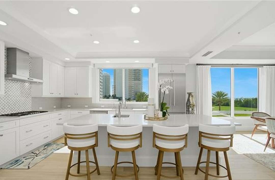 A stunning transitional-organic modern kitchen featuring a generous waterfall island with four coordinated barrel-back barstools, crisp white shaker cabinetry, and warm natural wood accents that balance contemporary clean lines with timeless elegance. Floor-to-ceiling windows and abundant natural light flood the open-concept space, which flows seamlessly onto a lush outdoor terrace, creating an aspirational indoor-outdoor living experience typical of high-end contemporary design.
