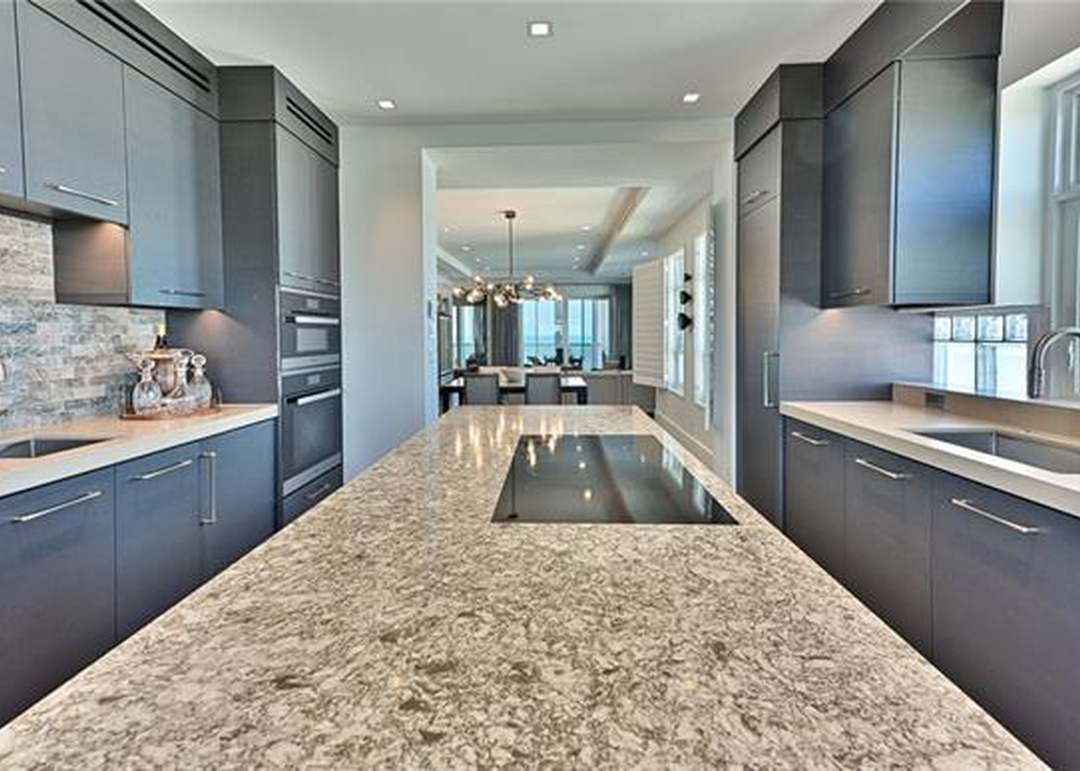 Countertop: QuartzCabinets: Flat PanelCabinet Color: GrayFlooring: TileBacksplash: Stone SlabCeiling: Standard