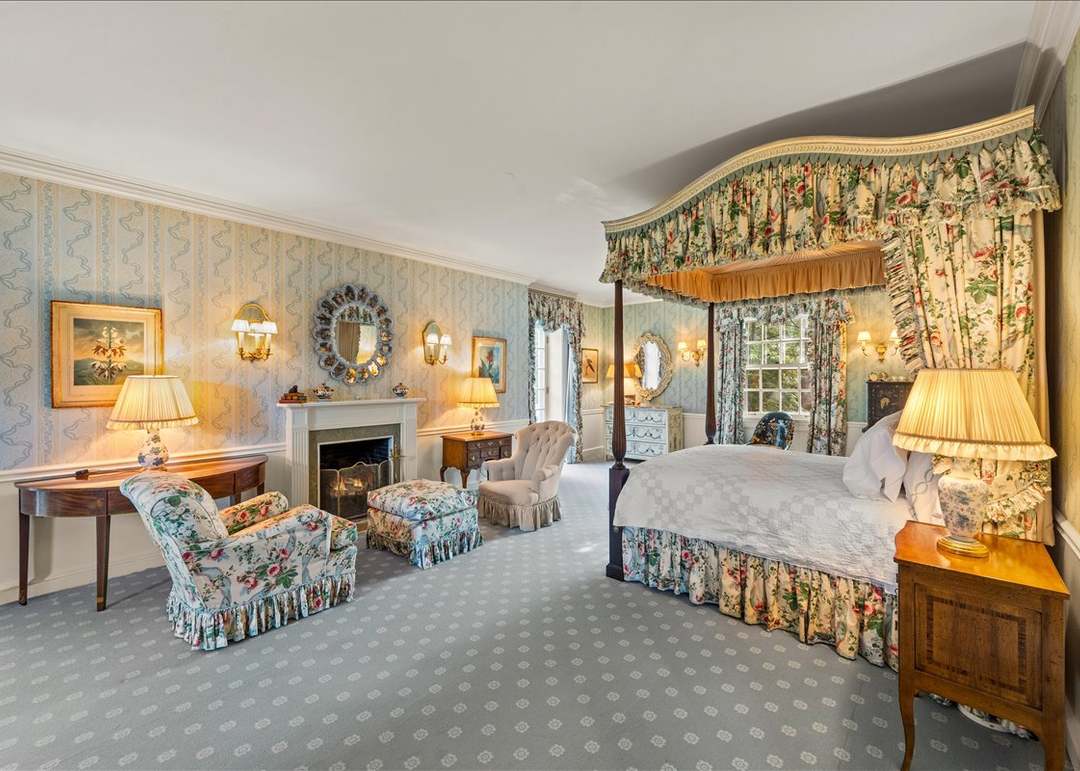 This exquisite primary bedroom suite showcases magazine-worthy elegance with a four-poster canopy bed, coordinating floral window treatments, and layered upholstered seating arranged around a working fireplace. The sophisticated palette of cream, pale blue, and multi-colored florals is anchored by fine wallpaper, brass accents, and impeccable traditional millwork, creating a serene yet grand retreat.