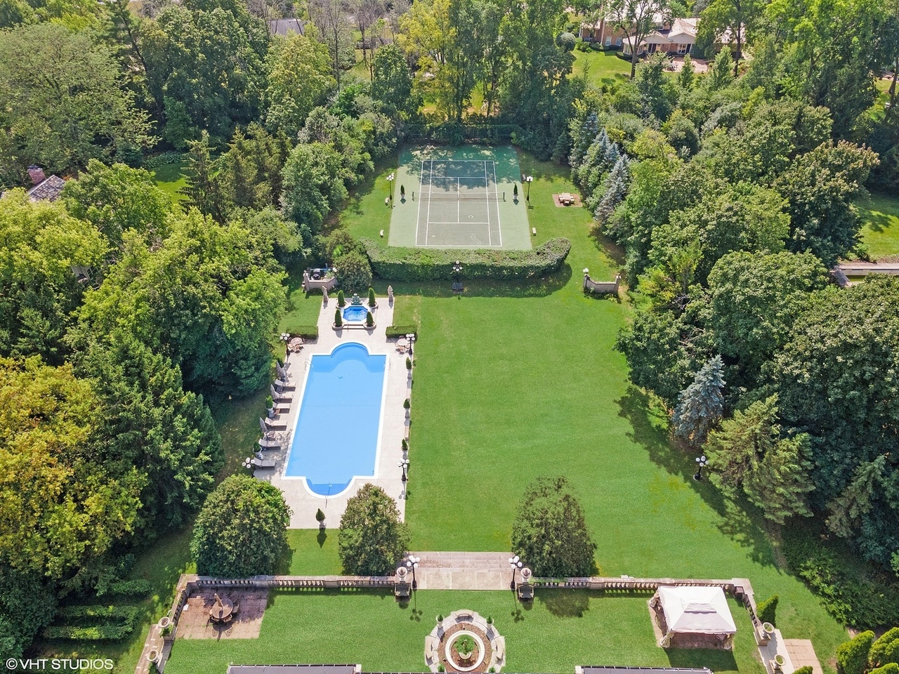 An expansive aerial view of an ultra-luxury estate's pool complex, featuring a resort-style swimming pool with accompanying spa/hot tub, surrounded by immaculate manicured lawns, mature hedging, and mature tree landscaping. The composition reveals classical estate planning with a tennis court visible in the distance, stone patio decking, and lounge seating areas positioned for optimal sun exposure and privacy—epitomizing East Coast Hamptons elegance combined with contemporary luxury resort amenities.