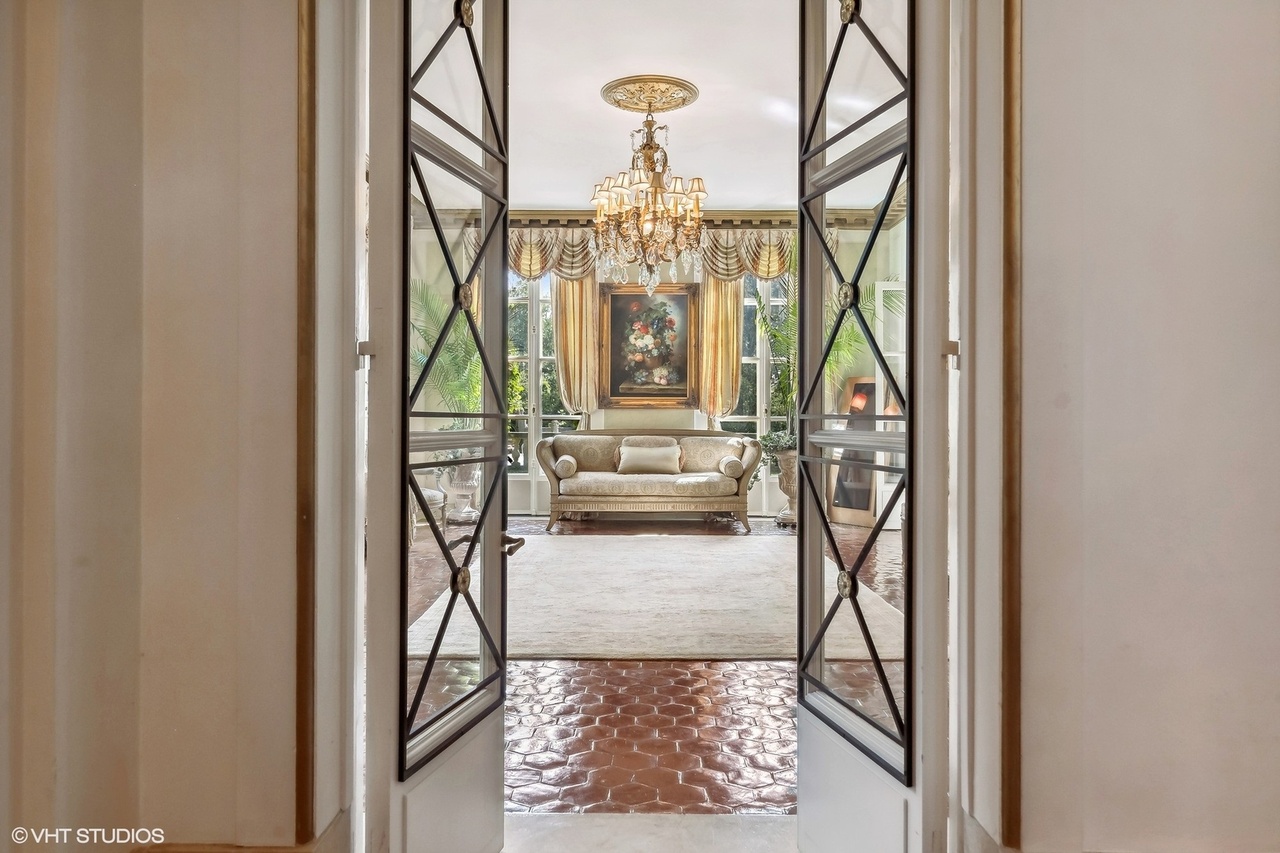 A sophisticated formal entryway framed by elegant black X-pattern doors, featuring a stunning brass crystal chandelier suspended above a cream upholstered sofa positioned against a backdrop of soaring windows with gold swag drapery. The space exemplifies transitional Hollywood Regency glamour with its terracotta hexagonal flooring, crown molding, and carefully curated classical floral artwork, creating an editorial-quality gallery view into an adjacent formal living room.