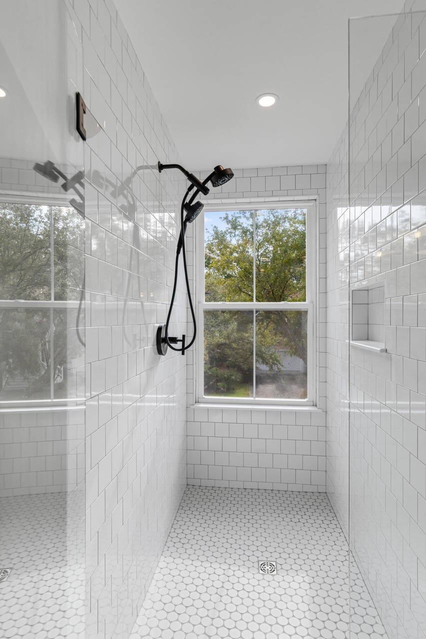 A stunning contemporary primary bathroom featuring floor-to-ceiling white subway tile, hexagonal floor tiles, and a frameless glass walk-in shower with dual rainfall showerheads and black hardware. The abundance of natural light from the oversized window overlooking mature trees creates an exceptionally serene and spa-like atmosphere, while minimalist design and clean lines convey effortless luxury.
