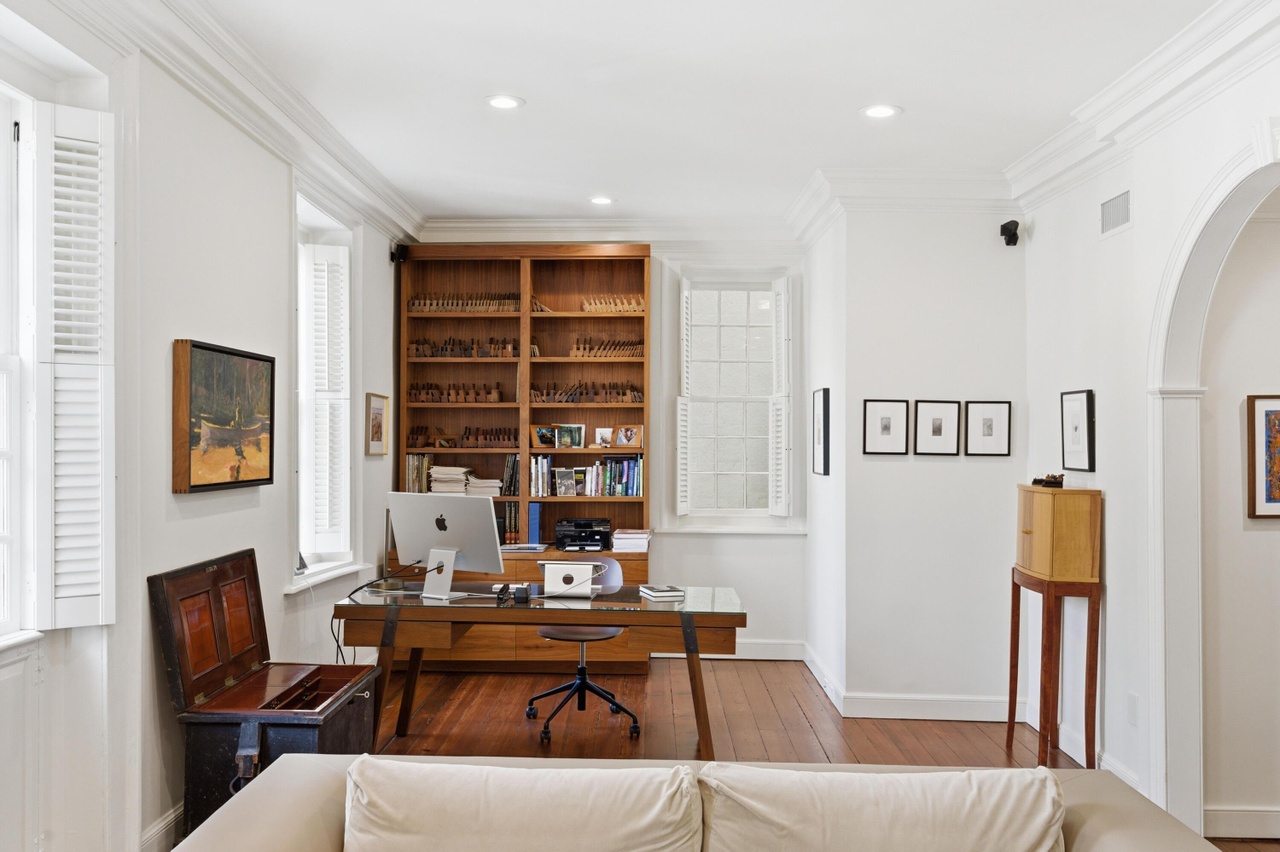 A sophisticated home office seamlessly blends mid-century modern furnishings with classic architectural details, featuring warm walnut cabinetry and desk paired against pristine white walls and elegant crown molding. Large gridded windows flood the space with natural light, while carefully curated artwork and collectibles displayed throughout create an intellectual, refined atmosphere that feels both professional and deeply personal.