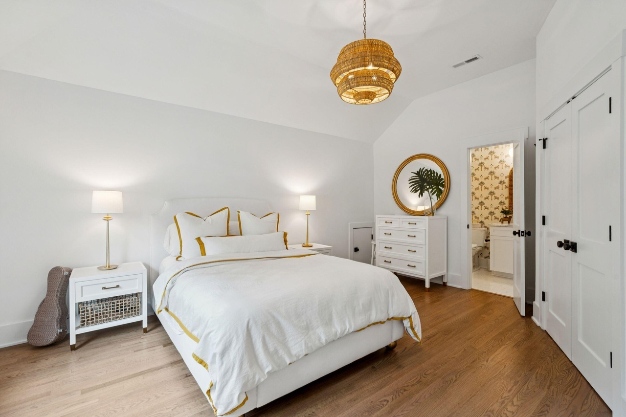 A serene primary bedroom suite featuring sophisticated transitional design with clean white cabinetry, warm hardwood flooring, and carefully curated brass and gold accents that provide elegant warmth. The design balances contemporary minimalism with organic natural materials—evident in the woven rattan pendant light and botanical artwork—creating a tranquil sanctuary with high-end finishes and thoughtful proportional details.
