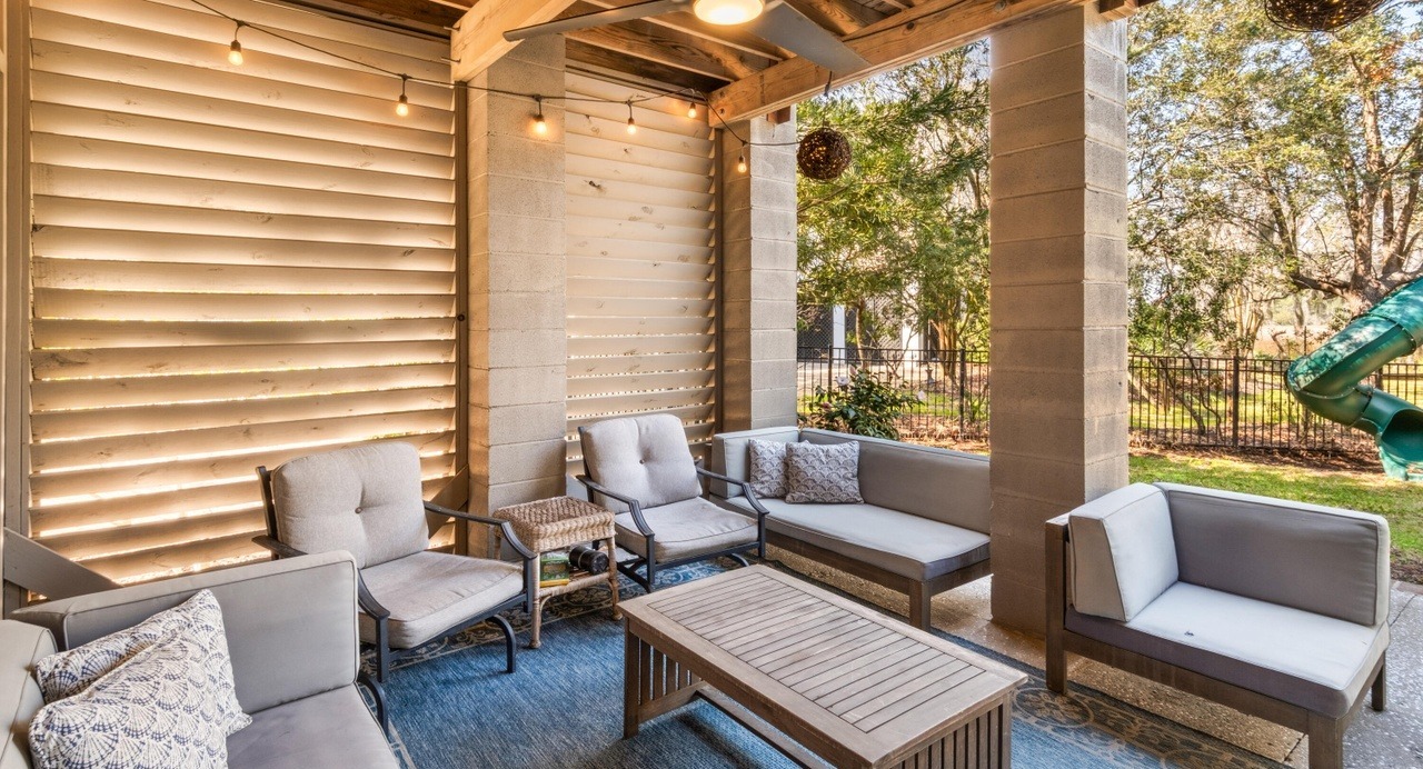 A sophisticated covered patio with seamless indoor-outdoor living, featuring warm wood beams, concrete architectural elements, and louvered screens that provide privacy and climate control. The neutral palette of grays, beiges, and whites is enhanced by natural materials and contemporary furnishings, creating a serene yet luxurious retreat overlooking manicured gardens.