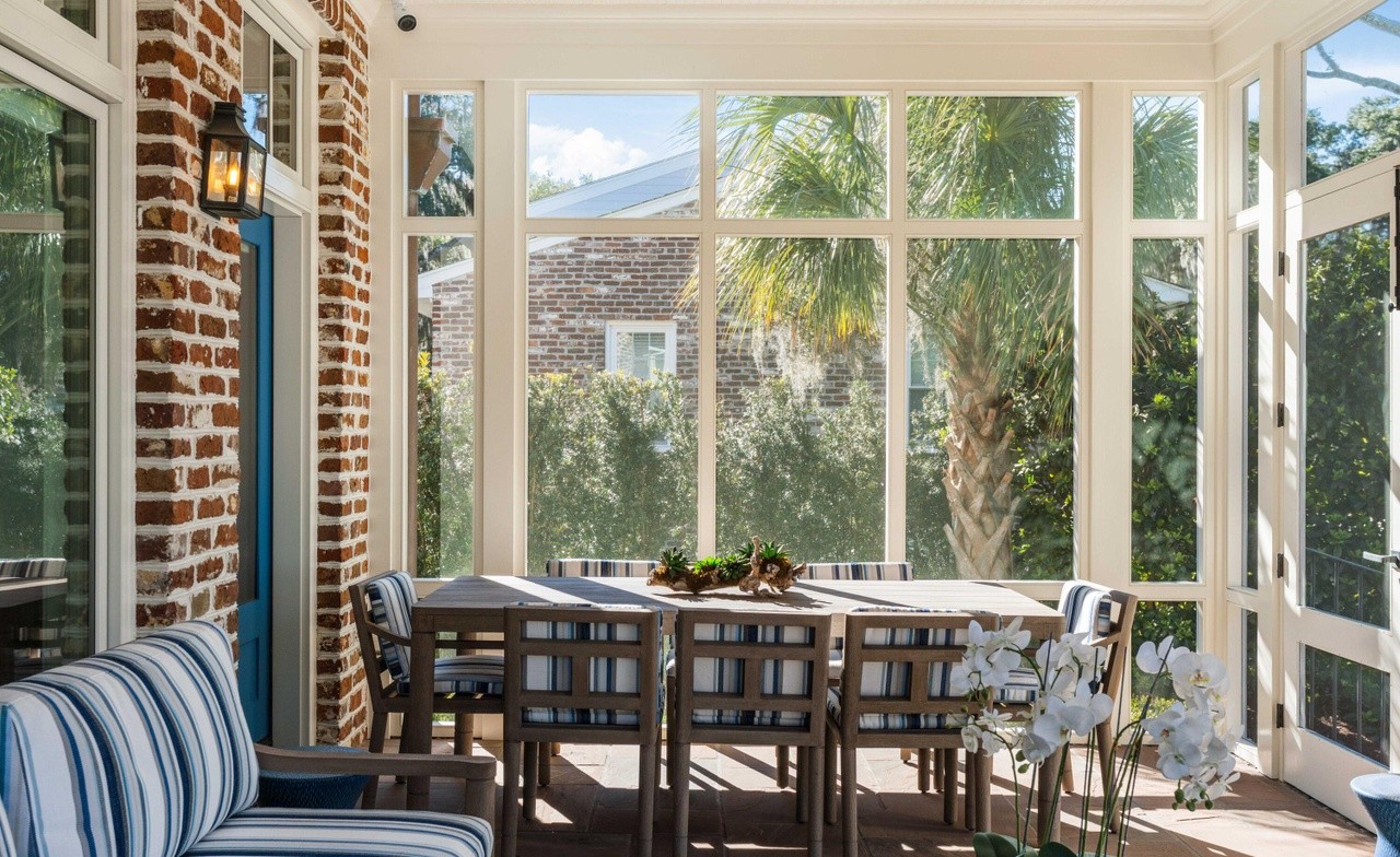A sophisticated covered patio with floor-to-ceiling white-framed glass walls overlooking lush tropical grounds, anchored by an elegant exposed brick fireplace and furnished with dark wood dining furniture in striped upholstery. The space seamlessly blends coastal elegance with traditional architectural details, creating an airy yet refined outdoor living environment flooded with natural light.