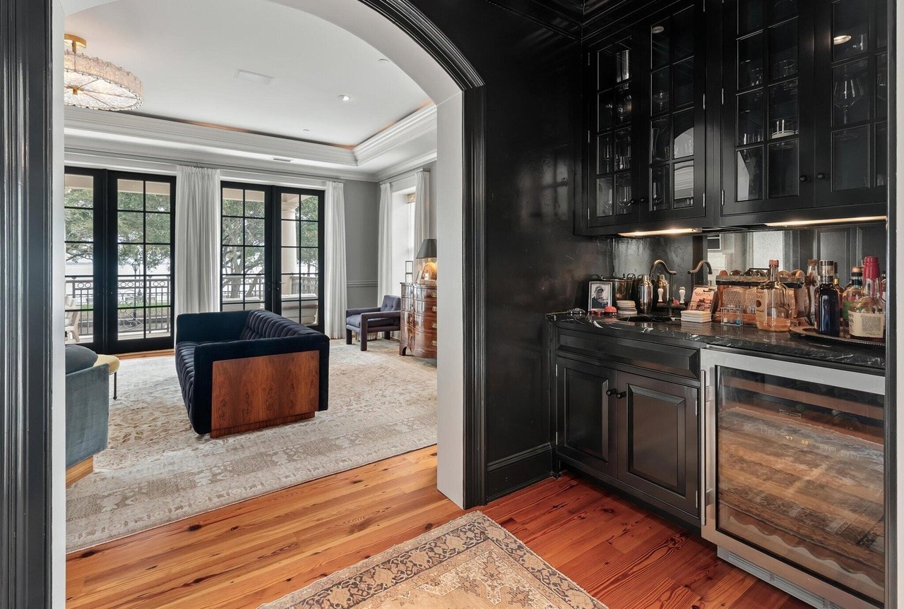 A sophisticated home bar featuring sleek black glass-front cabinetry with dark stone countertops and dramatic ambient lighting, seamlessly integrated into an open-concept living space with abundant natural light. The transitional design combines traditional architectural details (crown molding, coffered ceiling elements) with glamorous finishes and curated spirit collection, creating an elegant entertaining space with dramatic flair.