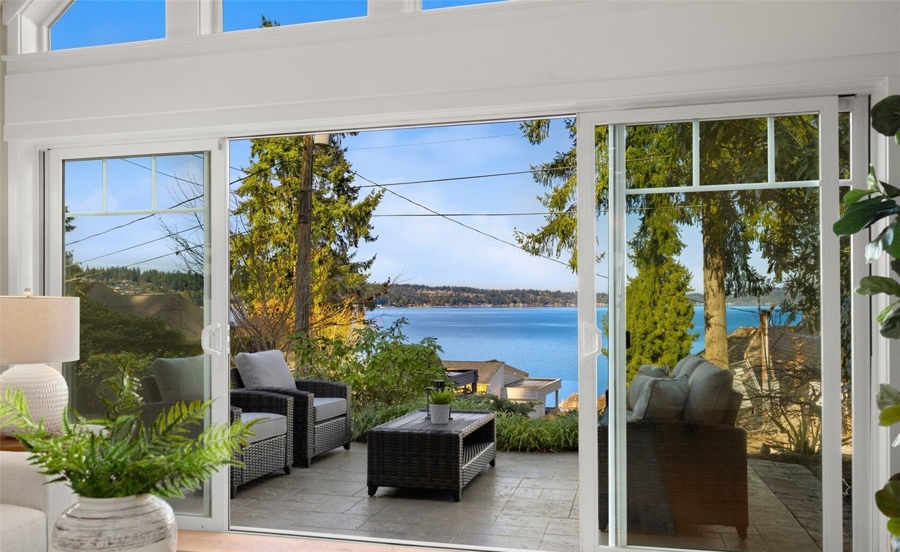 An stunning waterfront patio seamlessly blending indoor-outdoor living with expansive floor-to-ceiling glass walls framing a pristine lake view. The space features sophisticated black wicker lounge furniture, stone flooring, and abundant natural light filtered through skylights, creating a serene yet luxurious retreat that exemplifies contemporary Pacific Northwest design.